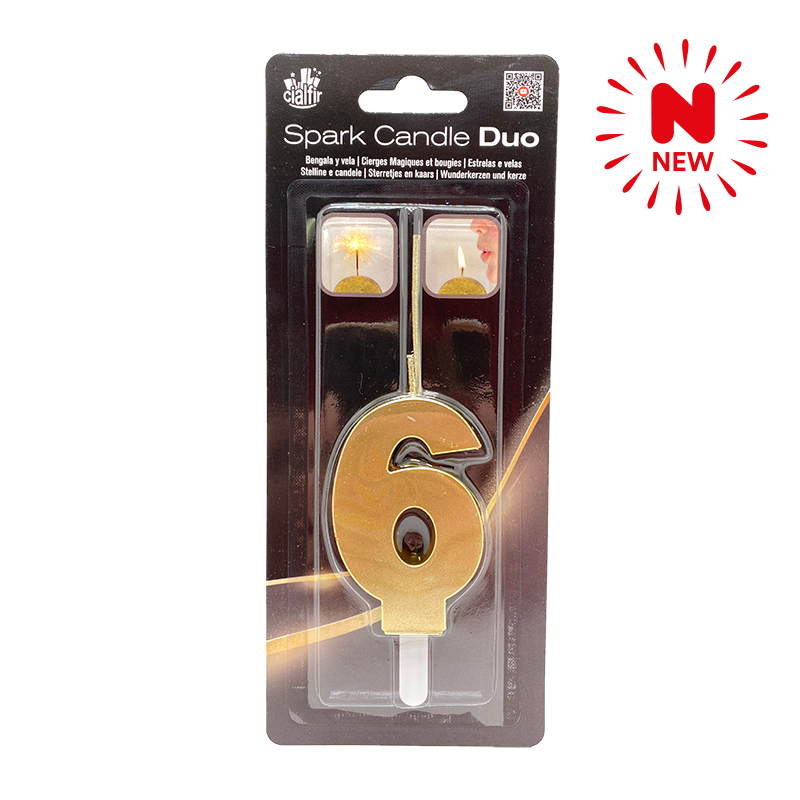 Espectacular e innovadora vela que al encenderse inicia con las chispas de una bengala y al cabo de unos segundos se transforma en una vela tradicional para soplar. Número 6
